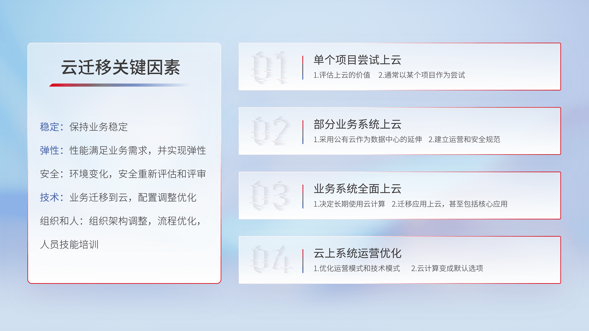 结合实际业务,,,从规划设计、、云平台选型、、、、云原生改造、、、、数据迁移、、、集成交付,,,迁移全过程为客户识别最佳上云路径,,做好风险识别管理,,,,设计网络架构、、身份权限、、安全审计合规、、、、操作审计、、、、日志审计、、、、监控告警策略、、多站点容灾设计等,,,,对云上基础设施进行整体规划,,,提升IT治理水平,,以满足弹性、、、、高可用、、、、高性能的需求。。