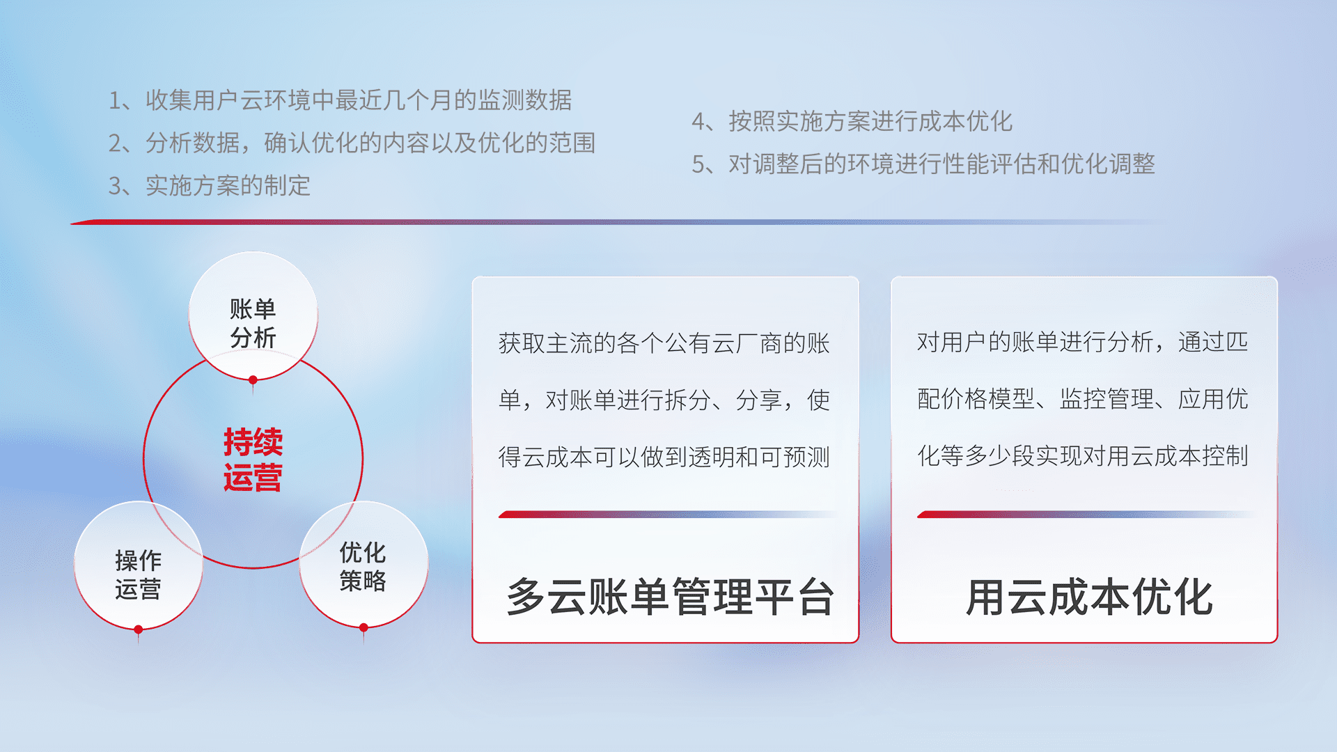 通过多云纳管,,以统一的资源数据模型把客户的云资源进行抽象和封装,,,进而实现对多云资源的统一操作,,保障云资源管理的可靠性、、稳定性与可用性。。量身定制化运维内容,,配置、、、、开发运维、、、、补丁管理、、、、备份、、、监控、、认证和访问管理、、、、审计和日常巡检等,,保障在用云过程中的可靠度,,,,稳定度以及高可用率。。。。